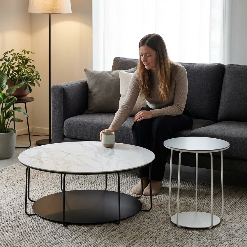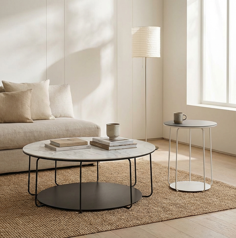 La esbeltez estructural de las mesitas auxiliares Cava juega en un perfecto equilibrio con la presencia que confiere la nobleza de su sobre. Bajo éste, la base genera una ilusión de sombra que aporta tridimensionalidad a una pieza que destaca por su ligereza. Sus diferentes alturas y proporciones ofrecen la posibilidad de crear un conjunto en el que ambas piezas funcionan en una impecable armonía.